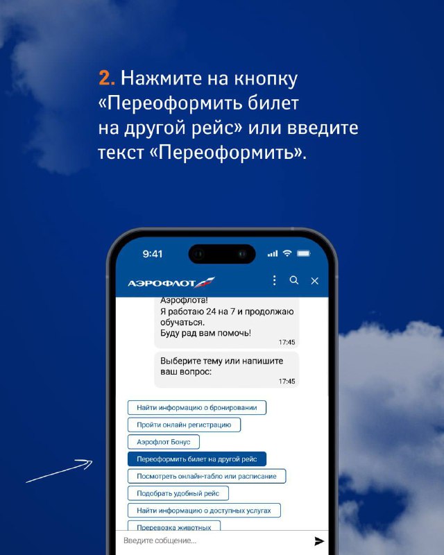 Переоформить билет можно самостоятельно, с помощью чат-бота на сайте или в нашем мобильном приложении, а также обратившись в контакт-центр авиакомпании. Подробнее о том, как оформить возврат через чат-бота читайте здесь.