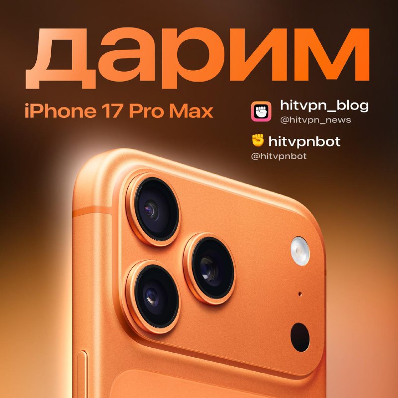 Дарим iPhone 17 Pro Max Space Orange! Месяц оранжевых айфонов продолжается! Новый iPhone 17 Pro Max в супер-модном цвете прямо сейчас может стать вашим всего лишь за пару простых действий! Просто делай это: • Будь подписан на @hitvpn_news • Подключи…