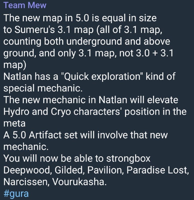 Ранняя информация по Натлану Размер карты в 5.0 будет примерно равен размеру Сумеру 3.1 (только 3.1, без джунглей, но с учётом всех пространств над и под землёй)