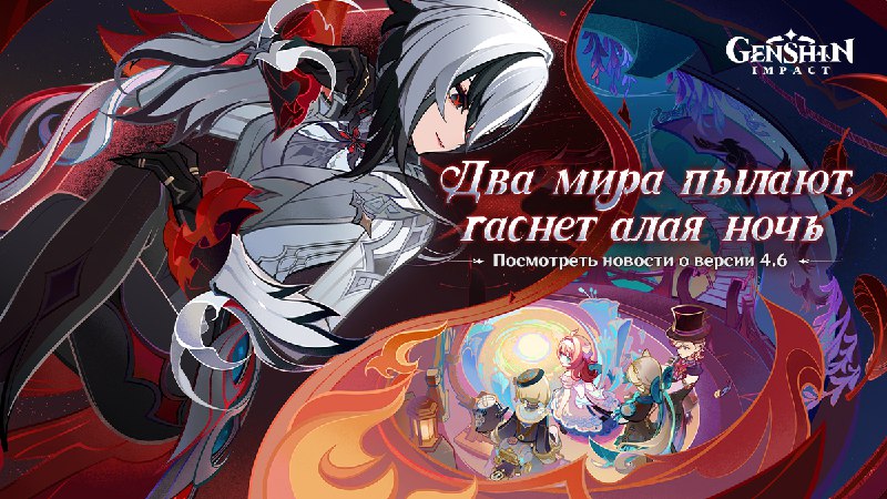 Genshin Impact - Предварительный просмотр версии 4.6 Узнать подробности! Любому плану нужен исполнитель.Да окрасит алая луна снег багрянцеми раздастся в морских глубинах симфония,пусть не молчат более пески, что хранят тайны,пока не останется ничего более как ожидать неотвратимой участи... Ветерок Мондштадта