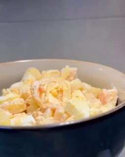 Выкладывайте слои в глубокую тарелку в последовательности как на видео. Каждый слой равномерно смазывайте майонезом (удобно выдавливать его через кондитерский мешок). Слой картошки не забудьте посолить!