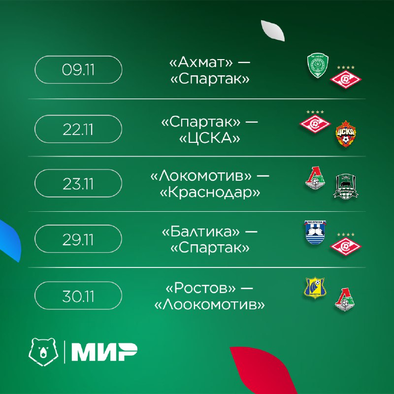 Позади почти половина сезона Мир РПЛ! И если вы еще не были ни на одном матче, пора это исправить. Может быть, сходить на один из этих? 9 ноября «Ахмат» — «Спартак»В прошлом сезоне «Ахмат» и «Спартак» дважды сыграли друг с другом с нулевыми ничьими. В сезоне 25/26 им предстоит впервые встретиться 9 ноября, и без голов здесь не обойдется. Грозненцы будут бороться за очки, чтобы улучшить свое положение в таблице, а столичный клуб постарается укрепить позиции в верхней части. Кто лучше справится с задачей, узнаем на следующей неделе.