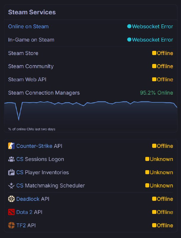 Steam ЛИКВИДИРОВАНПрямо сейчас не работают все сервера, включая CS2, Dota 2, Deadlock и Team Fortress.